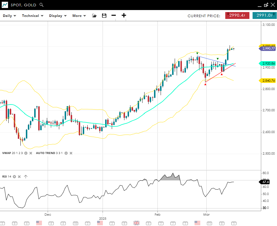 Gold has shifted to a more forceful bullish phase, trading near 2 990 above the 20‐day VWAP of 2 921. An RSI value of 68 signals robust momentum, albeit not yet fully overbought. Initial support waits at 2 841, while a push through 3 001 resistance would likely confirm another leg higher.