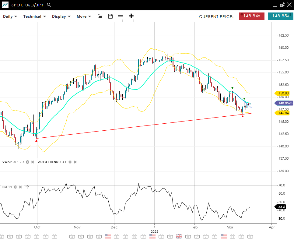 USD/JPY upholds its bearish direction, quoted at 148.85—still below the 20‐day VWAP of 148.00 in an impulsive manner. An RSI of 45 indicates moderate downward force, though not oversold. The pair’s nearest support resides at 146.84, while a climb above 150.83 would be required to test the current downtrend’s resilience.