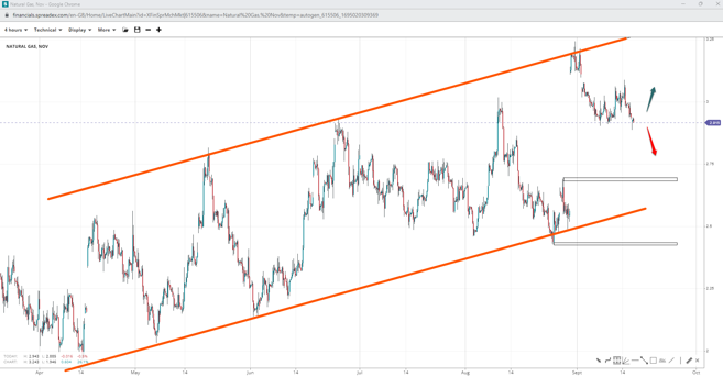 Natural gas prices stopped and reversed at the upper trendline of an ascending channel shy of $3.25/cf, with the commodity below the $3 handle opening up speculation for further declines towards $2.50/cf. With a short-term flag likely at play, focus shifts on the regional support of $2.70/cf, provided bulls fail to reclaim the round resistance or the local peak.