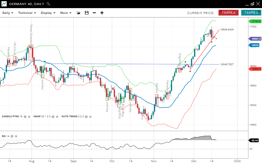 • The Germany 40 shows a bullish trend, near record highs with a rising VWAP at 16,535.