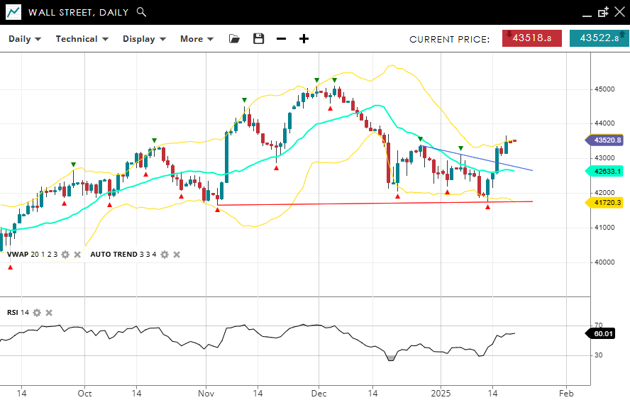Wall Street’s bullish trend looks like it could be about to resume after a long correction. Trading at 43,520, the price is above the VWAP (20) of 42,633. Support is noted at 41,720, while resistance is placed at 43,600. With the RSI at 60, the correction could provide a setup for continued bullish momentum.
