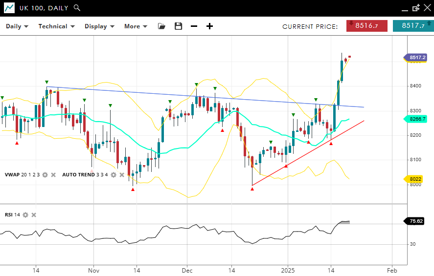 The UK 100 has made a major breakout with a bullish and impulsive tone, currently trading at 8,517, comfortably above its VWAP (20) of 8,266. The support level is defined at 8,022, while immediate resistance lies at 8,500. The RSI of 75 signals bullish momentum, affirming the prevailing trend.
