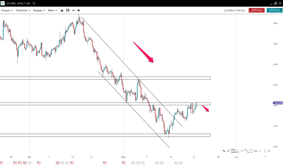 The price of silver also managed to break a bearish channel pattern to the upside. Currently, it is trying to break the 2,210 mark to the upside, however sellers are trying to take back control of the market. We can observe this via the bearish engulfing pattern near this zone. One potential scenario is to see a fake out to the upside before sellers will push the price to the downside toward the 2,055 level.