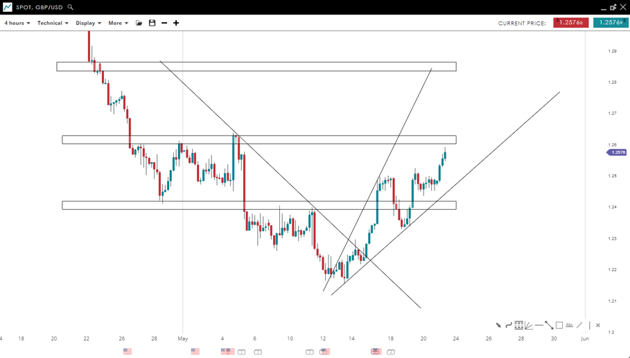 Buyers managed to break the bearish trend line to the upside after the price failed to break the support zone near the 1.2200 level. Now, the price trades inside an ascending bullish flag, and looks to be heading to resistance at 1.2615. Again, if bulls manage to break this new resistance to the upside and close above it, this could lead to a further upside movement to the 1.2850 mark.