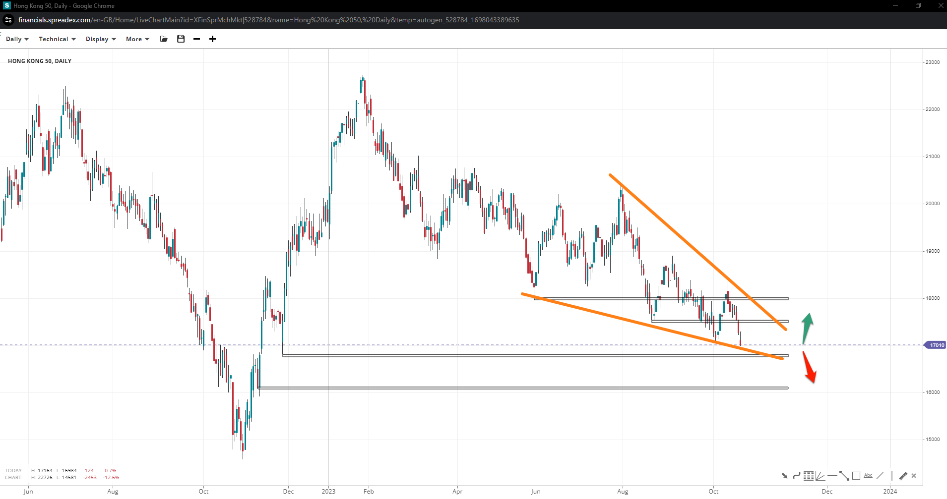 The US Tech index exhibits an overall negative PA near the bottom of 14430, exposing 14250 as part of a wedge pattern. 14900 is seen as a regional high above 14780.