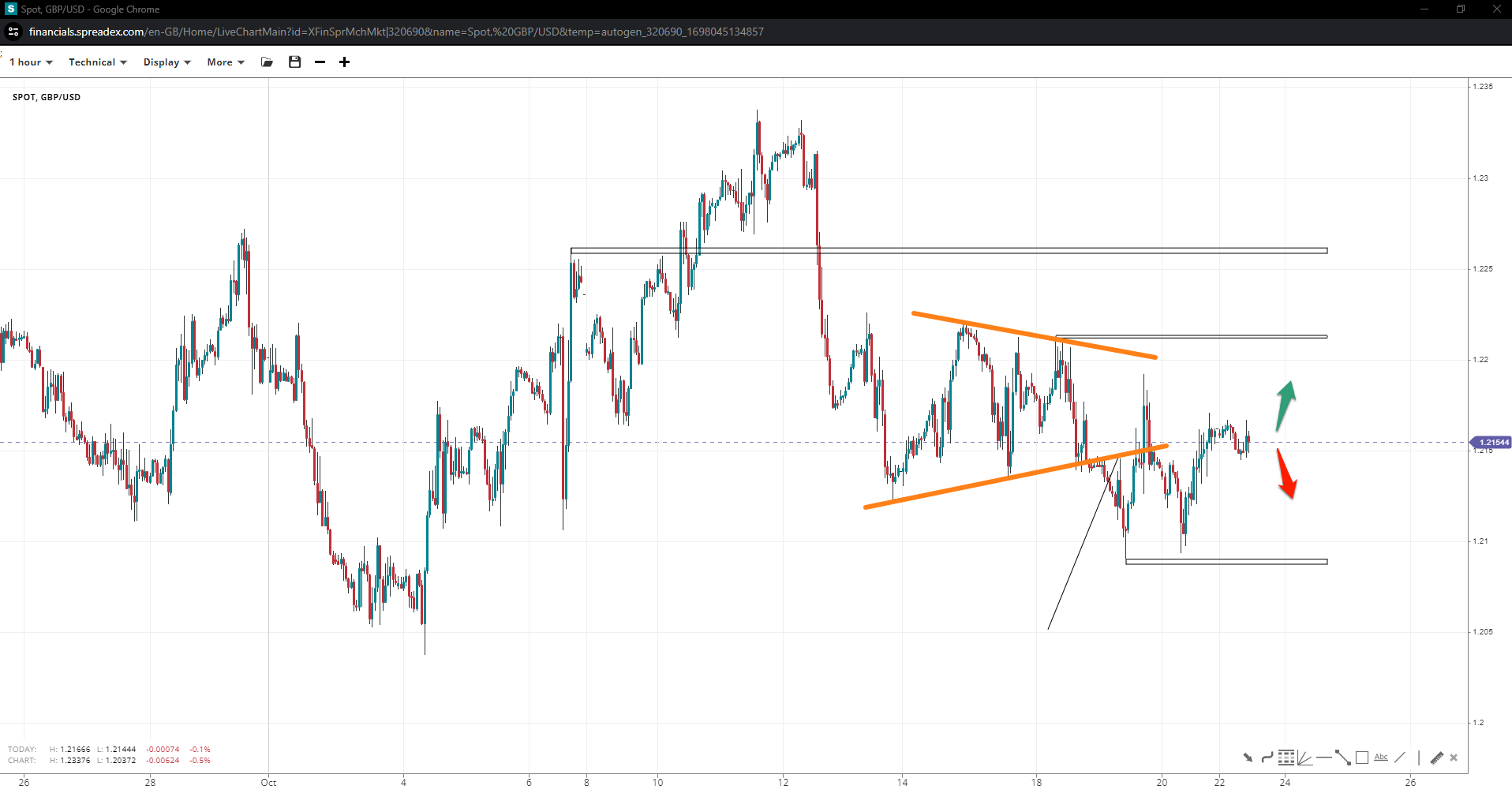 Bulls rejected the attempt at $1.21, with recent price action suggesting a sideways market between $1.2087 and $1.2212. If prices accelerate past the top, the pair could revisit $1.2261. However, a breakdown might send prices to the measured move target of the complete triangle, paving the way to $1.2050.