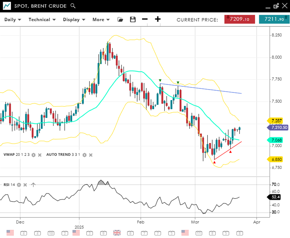 Brent Crude continues its bearish trajectory in a corrective phase at 7,210, above the 20‐day VWAP of 7,068 but overshadowed by a broader downtrend. The RSI at 52 signals mild momentum. Sellers are eyeing 6,850 support for another leg lower; any bounce could stall at 7,287.