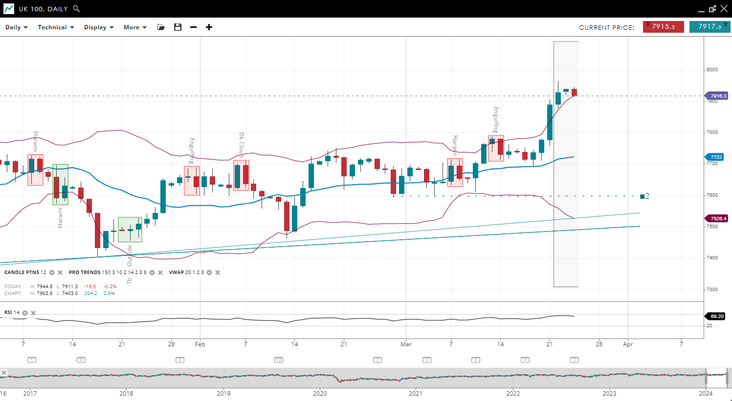 NOTE: These charts use the ‘Pro Trading Tools’ available on the SpreadEx trading platform. To use them, log in to your and click ‘Technical’ from the menu on any chart.