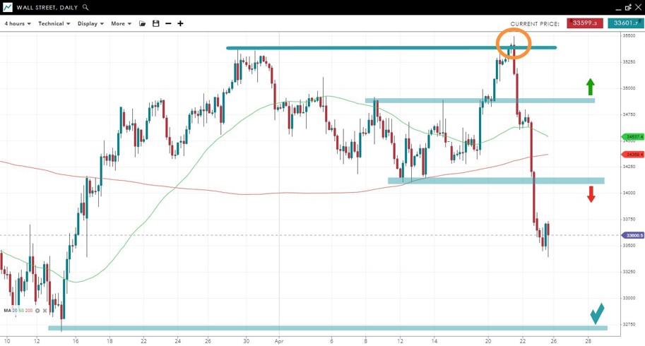 The price made a fakout over the March 29 peak before crashing back under its moving averages. The sharp downwards price action has flipped the market to a bearish bias. Former support at 34,100 could act as resistance to any bounce with 32,750 the next significant support further down. A move over 34,900 would nullify the bearish bias.
