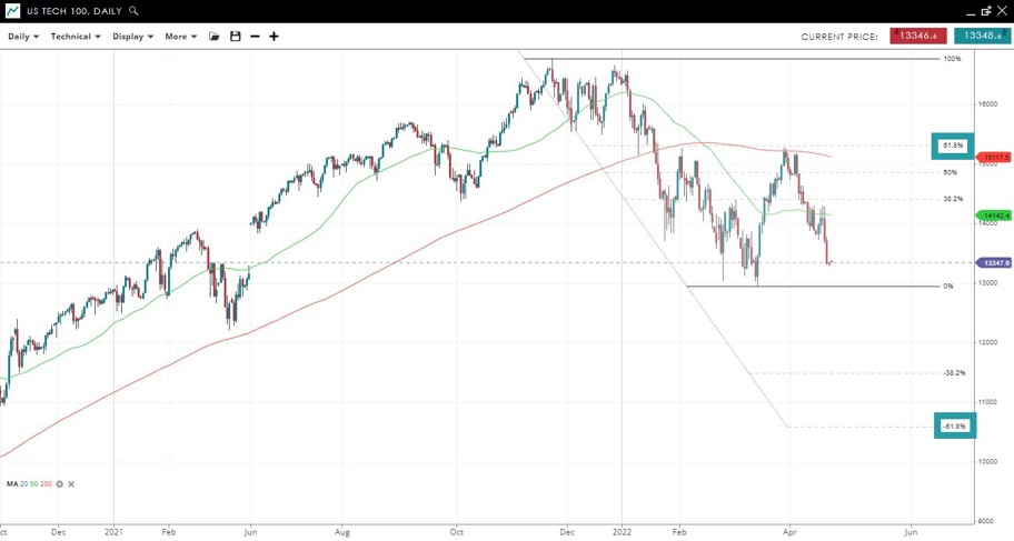 The Nasdaq 100 index retracted 61.8% of its drop from record highs before turning lower again. A break under 13,000 could target the 61.8% Fibonacci extension near 10,500.