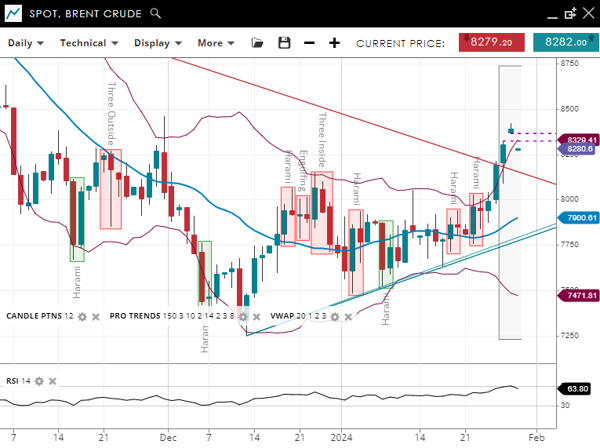Brent Crude is in the impulsive phase of a bullish trend, with its price well above the 20-period VWAP of 79.03. It has established support at 74.65 and is testing resistance at 83.30, closely matching its current price. The RSI is at 66, indicating bullish momentum, suggesting continued upward price movement.