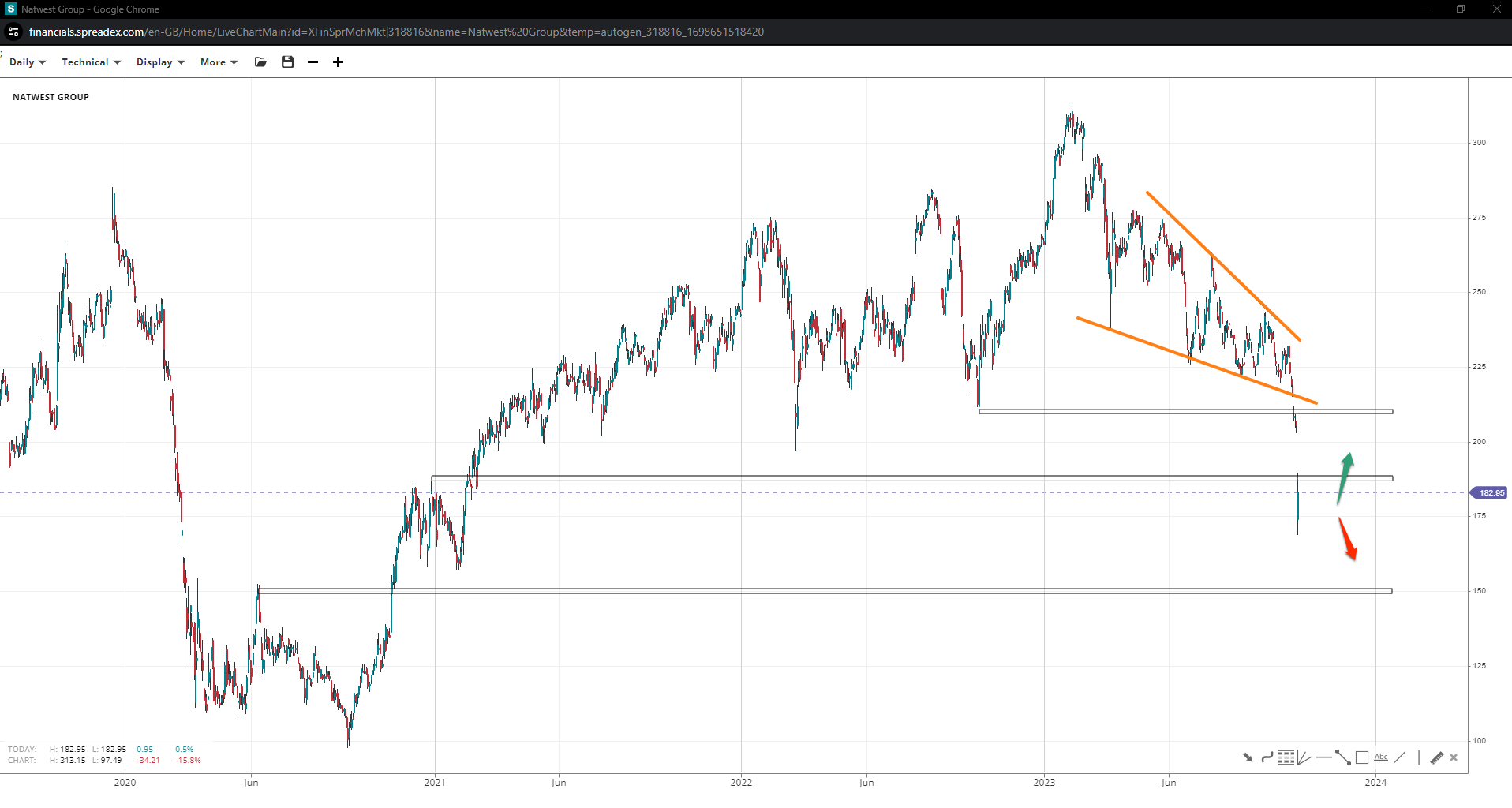 Natwest’s share price entered the bearish territory under 188p following a wedge breakout, with the risk towards 150p rising. Bulls must recuperate losses to 200p at least before somewhat abandoning the high-risk zone below 210p.