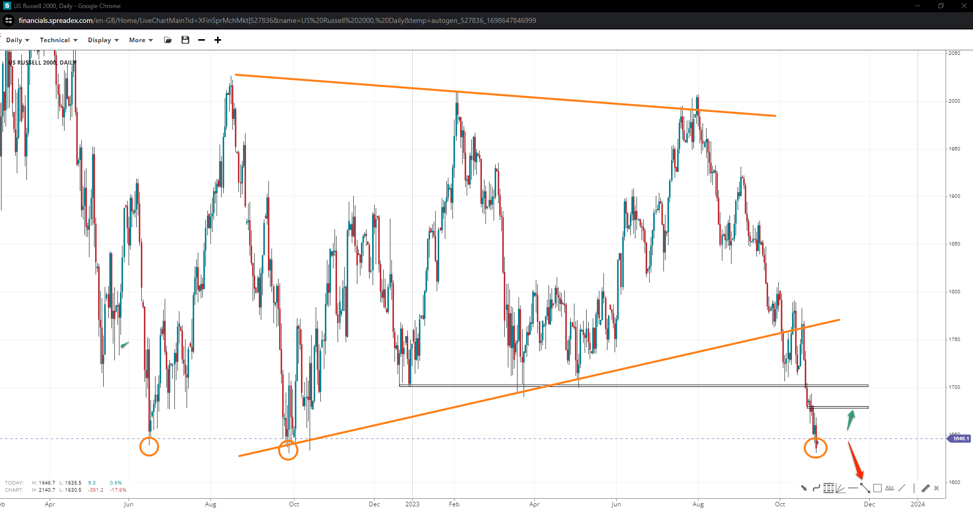 A triple bottom formation could see Russell 2000 bounce towards 1700 if 1675 gives in, with chances at 1600, the next logical round support,  increasing.