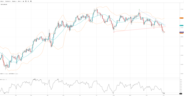 GBP/USD has weakened to test the bottom of its multi-month range setting up possible breakdown into a new bearish trend, currently at 1.3127 and beneath the VWAP of 1.3309. The RSI at 30.4 signals oversold conditions. Support is at 1.3106, with resistance at 1.3513.
