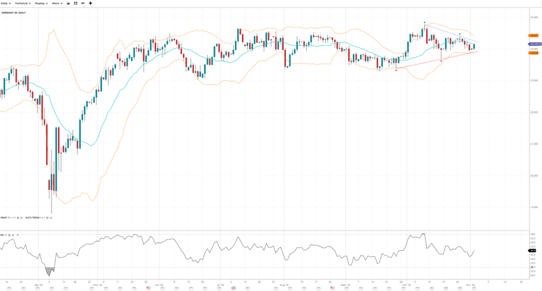 Germany 40 is still stuck in a neutral range phase. Price is at 24,159, close to the VWAP of 24,150. The RSI at 50.3 suggests a totally neutral bias. Support is at 23,878, and resistance is at 24,427.