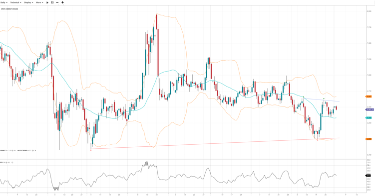 Brent Crude is still bearish overall, though it has entered a correction phase- and could be staging a trend reversal. Price is at 6,461, hovering above the VWAP of 6,333. RSI at 51.5 indicates a neutral stance. Support is found at 6,000, while resistance caps at 6,667.