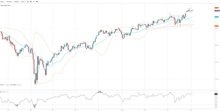 Wall Street maintains its bullish trend and is still in an impulsive phase, trading at 47,643 and comfortably above the VWAP of 46,711. The RSI at 68.0 reflects strong upside pressure. Support lies at 45,359, with resistance at 48,063.