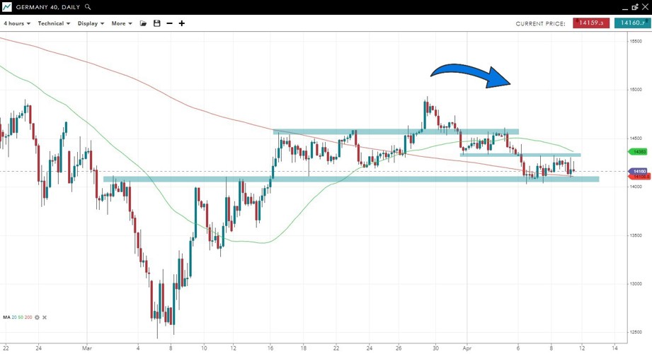 The index has rolled over to former resistance and support from the March 18 low around 14,050 - with 14k being the major level for consideration. A breakdown from support might not find much technical support until 13,500.