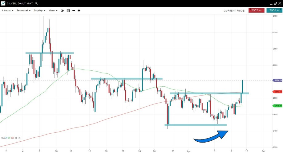 Silver successfully tested the late March lows and has since rebounded strongly with a move back over the 50 then 200 SMA. The last high momentum rally on March 24 saw heavy selling follow shortly after, that remains a risk this time - but the correction from the March 9 high seems to have ended.