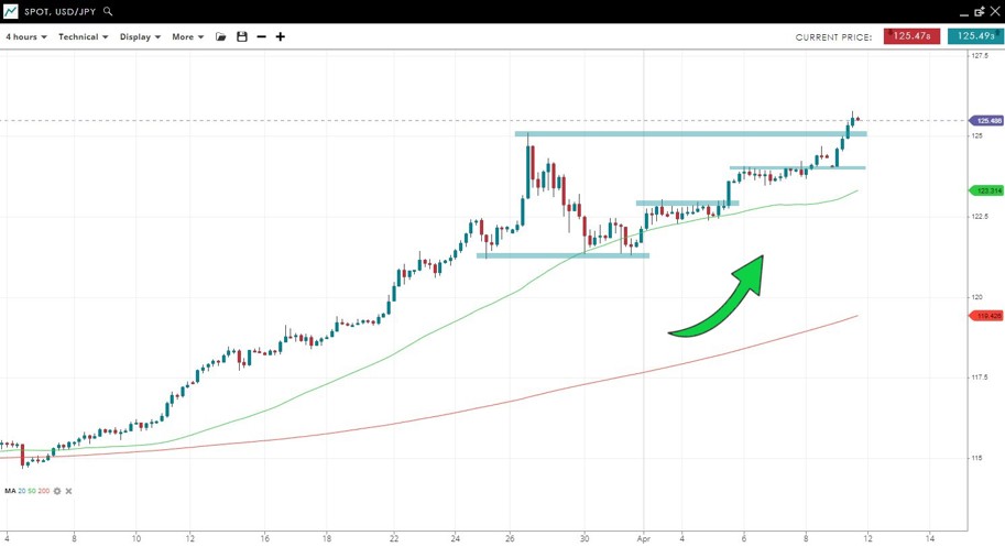 The trend is your friend with the Japanese yen. The pair has broken out to fresh multi-year highs, quickly recovering from the pullback from 125 to 123.3. There is the risk of a fakeout but signs of selling look limited no large red candles since the price moved back over the 50 SMA in April.