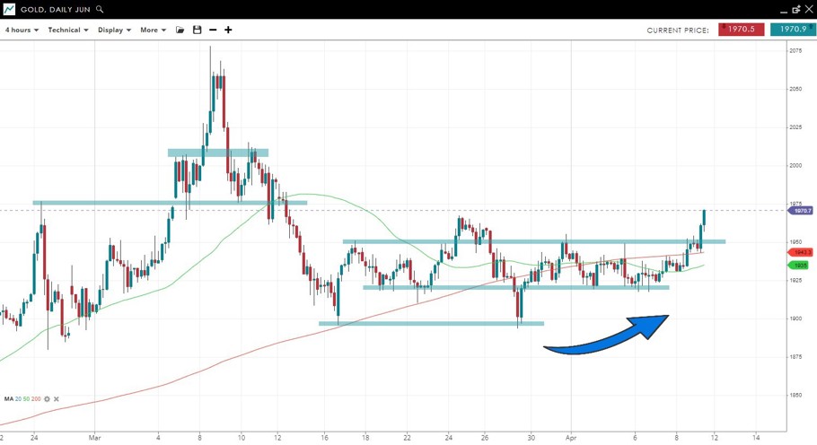 Platinum saw a strong reversal off its year-to-date lows and managed to close above the previous low formed on March 28. A break above the downtrend line connecting the recent highs could confirm that the low is in.