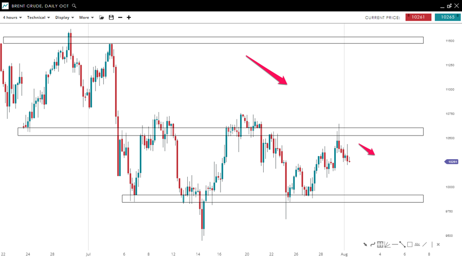 UKBRENTOIL is trading inside a parallel channel between 98 & 105. The market tested the higher end of this channel and was pushed lower. So, while it is range-trading, the market could continue its move lower toward the lower end of this channel. A close above the 105 mark could signal a reversal and a move higher toward the 114 mark.