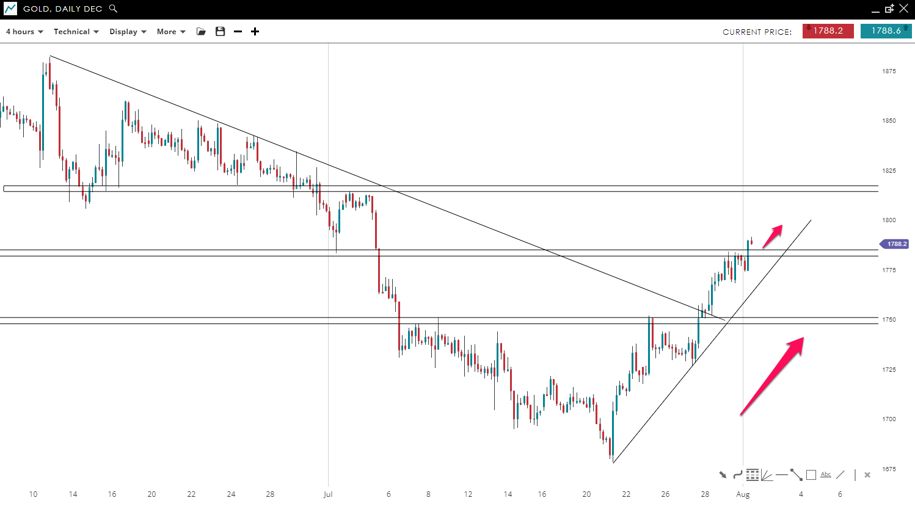 Gold is an upward movement where higher highs and lows have been posted since breaking above a bearish trend line and closing above the 1,780 mark. If more buyers join the uptrend around the 1,780 mark, this could lead to a further movement to the upside toward the 1,815 mark. However, a move and close below the 1,750 would negate our bullish view.