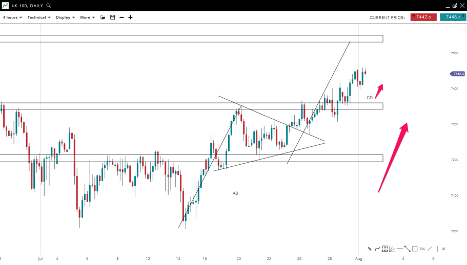 UK 100 is in a clear uptrend where higher highs and lows have been posted. The price successfully broke the bullish wedge pattern to the upside and the resistance level (now support) near the 7,350 mark. Further movement to the upside is expected to test the 7,540 level in the coming days. A close below 7,200 mark would negate our bullish bias.