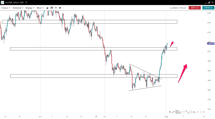 The price of Silver successfully broke the triangle pattern to the upside after finding buyers near the 1,875 mark. Silver rallied all the way up to and broke the 2,000 mark. Further movement to the upside is expected in the same direction of the main trend toward the 2,150 level. If the price fails to continue its move higher and reverses lower below the pivot level, Silver could test the 1,875 support.
