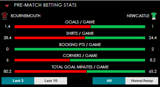 To see all the Bournemouth v Newcastle betting stats and form, visit our pricing page to view our Pre-Match betting stats table or hover over/tap the chart image to see previous outcomes for that particular market.
