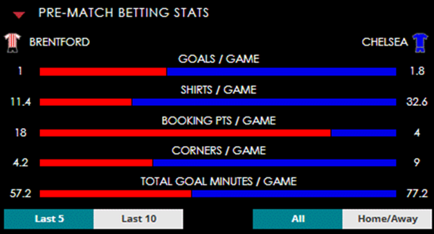 To see all the Brentford v Chelsea betting stats and form, visit our pricing page to view our Pre-Match betting stats table or hover over/tap the chart image to see previous outcomes for that particular market.